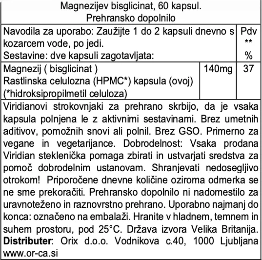 V tej formulaciji je magnezij vezan na aminokislino glicin, kar omogoča optimalno absorpcijo in uporabo v telesu. Ta biološko razpoložljiva oblika magnezija je blagodejna za prebavni sistem in zagotavlja 160 mg magnezija v kapsuli.