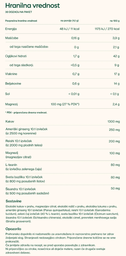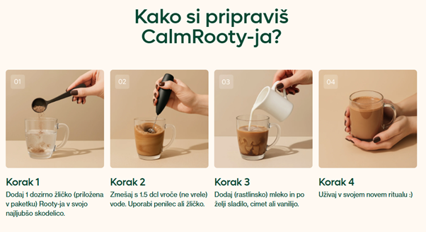 CalmRooty je okusno prehransko dopolnilo iz adaptogenov, superživil in medicinskih gob, zasnovano za pomiritev, naravno podporo pri stresu in notranje ravnovesje.¹ Ko je tempo hiter in telo pod stresom, je CalmRooty tu, da te nežno vrne v ravnovesje – naj bo to zjutraj, čez dan ali zvečer.